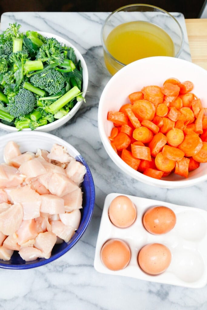 - In a saucepan add the extra virgin olive oil and cubed chicken and cook over medium heat until the chicken is no longer pink. Add in the broccoli, and carrots and top with the bone broth and the whole egg (yes the shell too!) and cook for ten minutes until the veggies are soft. Mix everything together well until it almost looks like a scramble.