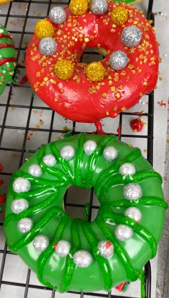 - Step 6: Dip each donut in the red or green glaze and place on a cooling rack so that the frosting can drip off. Do this step quickly as we need to add the sprinkles immediately before the frosting sets on the donuts.